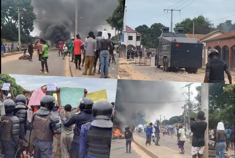 Personnel from the Gambia Fire and Rescue Service were seen extinguishing burning tires and clearing debris from the road on Sunday.